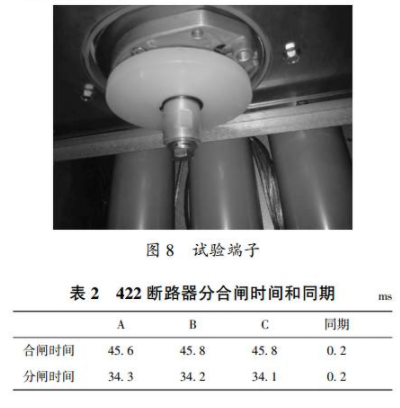 本次試驗(yàn)選取422斷路器進(jìn)行機(jī)械特性測(cè)試,按圖6進(jìn)行試驗(yàn)接線(xiàn)。將4221隔離開(kāi)關(guān)置于接地位置,將試驗(yàn)端子接到柜內(nèi)電纜接口,然后將試驗(yàn)線(xiàn)接到試驗(yàn)端子下端進(jìn)行試驗(yàn)。試驗(yàn)端子如圖8所示。422斷路器分合閘時(shí)間和同期見(jiàn)表2。
