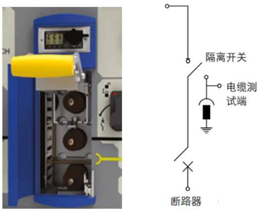 即對三工位開關(guān)接地靜觸頭設(shè)備絕緣套管和可拆開的接地短接排,如施耐德的RM6,為了檢驗電纜絕緣和查找缺點,有或許在不斷開聯(lián)接設(shè)備的狀況下,經(jīng)RM6向電纜引入42kV直流試驗電壓,持續(xù)15分鐘;為了通過接地觀察窗引入直流試驗電壓,應(yīng)閉合接地開關(guān)和翻開可移動接地聯(lián)接設(shè)備,試驗時需運用特別試驗夾子。