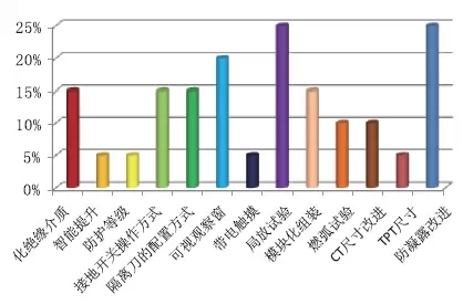 經過調研被參與者心中新產品哪些部分應當進行優化,認為應優化絕緣介質部分的占比15%,智能行進部分的占比5%,防護等級部分的占比5%,接地開關操作辦法的占比15%,阻隔刀的配置辦法的占比15%;可視觀察窗的占比20%,帶電觸摸的占比5%,局放試驗的占比25%,模塊化組裝的占比15%,燃弧試驗的占比10%CT標準改善的占比10%;TPT標準的占比5%,防凝露改善的占比25%。如圖15所示。